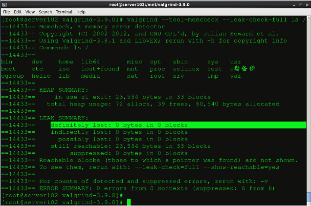 完成之后我們就可以對系統(tǒng)中的程序進行檢測了,首先我們用ls顯示根目錄下的文件,ls命令是沒有內(nèi)存泄漏的: