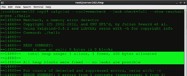 linux下檢測內(nèi)存泄漏工具Valgrind簡介 在我們編寫C/C++的時候,最常見的錯誤之一就是內(nèi)存泄露,這樣的問題其實跟程序員的編程習慣密不可分。如果你在虛擬主機申請內(nèi)存空間之后能夠馬上在合適的位置釋放內(nèi)存。會極大程度的避免內(nèi)存泄漏的情況。但是人非圣賢,孰能無過。有時候我們確實忘記釋放內(nèi)存而導致了比較嚴重的錯誤,所以這個時候我們需要借助valgrind這個工具來判斷內(nèi)存泄漏。 Valgrind 是一款 Linux下(支持 x86、x86_64和ppc32)程序的內(nèi)存調(diào)試工具,它可以對編譯后的二進制程序進行內(nèi)存使用監(jiān)測(C語言中的malloc和free,以及C++中的new和delete),找出內(nèi)存泄漏問題。 Valgrind 中包含的 Memcheck 工具可以檢查以下的程序錯誤: 使用未初始化的內(nèi)存 (Use of uninitialised memory) 使用已經(jīng)釋放了的內(nèi)存 (Reading/writing memory after it has been free’d) 使用超過malloc分配的內(nèi)存空間(Reading/writing off the end of malloc’d blocks) 對堆棧的非法訪問 (Reading/writing inappropriate areas on the stack) 申請的空間是否有釋放 (Memory leaks – where pointers to malloc’d blocks are lost forever) malloc/free/new/delete申請和釋放內(nèi)存的匹配(Mismatched use of malloc/new/new [] vs free/delete/delete []) src和dst的重疊(Overlapping src and dst pointers in memcpy() and related functions) 重復free valgrind的使用實例: 在官網(wǎng)上找到valgrind的tar包,解壓,編譯。完成后make安裝: