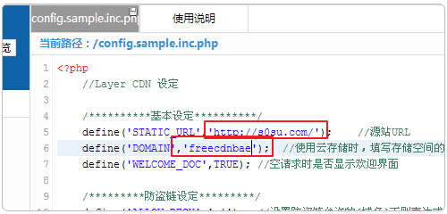 2、Layer的設置都在config.sample.inc.php文件中,打開該文件,可以看到Layer的基本設定。說明如下: /**********基本設定**********/define('STATIC_URL','http://www.****.com/'); //源站URL define('DOMAIN','freecdnbae'); //使用云存儲時,填寫存儲空間的名字;使用本地存儲時,填寫存儲的相對路徑。 define('WELCOME_DOC',TRUE); //空請求時是否顯示歡迎界面