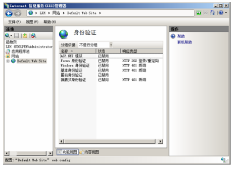 第二步,安裝完成后,打開 IIS 管理器,再打開“身份驗(yàn)證”窗口,所經(jīng)安裝的身份驗(yàn)證方式顯示在列表中,并且默認(rèn)均為禁用狀態(tài),如下圖所示。