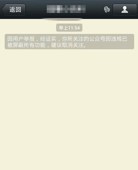 筆者添加了幾個被封號的賬戶,發現歷史消息也被清零,添加后消息提醒“因用戶舉報,經證實,你所關注的公眾號因違規已被屏蔽所有功能,建議取消關注”。