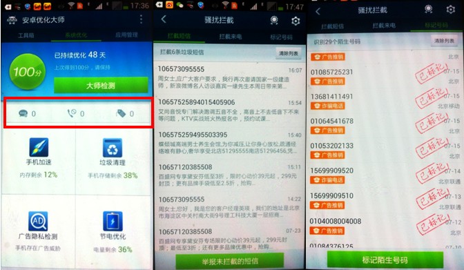 行業(yè)專家建議,安裝手機管理軟件能有效杜絕這種現(xiàn)象的發(fā)生,如安卓優(yōu)化大師等市場上的主流手機優(yōu)化管理軟件,都具備攔截騷擾電話、垃圾短信等功能。相關(guān)數(shù)據(jù)顯示,通過安卓優(yōu)化大師的精準(zhǔn)攔截,手機被騷擾的概率能有效降低91%。
