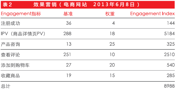 為了后面的計算關系,我們把每個Engagement指標都變成1為基準,我們可以得到一系列比例關系, 有了這個對應關系,我們可以很容易地給轉化發生之前的所有重要事件定義Engagement的權重。如果我們以1個轉化為100分計算,按照各個不同行為的實際值,計算出各指標的Engagement Index完全輕而易舉(表2)。