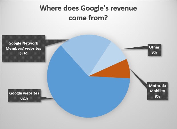 兩年前,谷歌還是一個偏科生。當時它的收入幾乎全部來自廣告。其2011年的報告里寫,“2009年我們收入的97%來自廣告,2010與2011年則有96%來自廣告。”隨著谷歌收購摩托羅拉移動,谷歌試圖進入硬件領域,你可以看到它的收入結構有了些微的變化。不過最近它把這塊業務賣給了聯想,可能其收入結構又要回到當初。“其他”(Other)類別里,主要是包括其數字內容與非摩托的硬件產品,這塊仍占公司收入的很少一部分。所以摩托羅拉移動售出后,谷歌的廣告收入又要回歸到占比90%以上的地位。