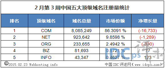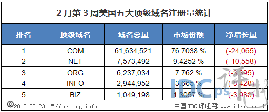 (圖1)2月第3周中美五大頂級域名注冊量統(tǒng)計(截至2015-02-23)