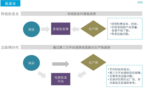 傳統(tǒng)批發(fā)業(yè)有極大的地域限制,一個(gè)想在北京開(kāi)家小禮品店的店主需要大老遠(yuǎn)的跑到浙江去進(jìn)貨,不僅要面對(duì)長(zhǎng)途跋涉并且還需要面對(duì)信任問(wèn)題。所以對(duì)于進(jìn)貨者來(lái)說(shuō),每次批發(fā)實(shí)際上都是一次風(fēng)險(xiǎn)。