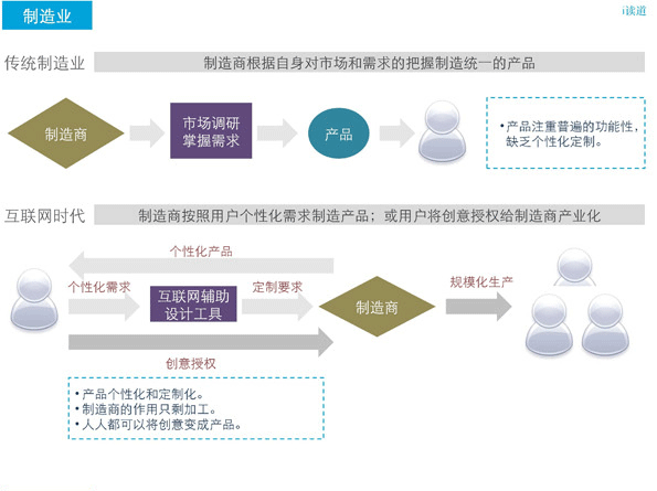 傳統(tǒng)的制造業(yè)都是封閉式生產(chǎn),由生產(chǎn)商決定生產(chǎn)何種商品。生產(chǎn)者與消費(fèi)者的角色是割裂的。但是在未來(lái),互聯(lián)網(wǎng)會(huì)瓦解這種狀態(tài),未來(lái)將會(huì)由顧客全程參與到生產(chǎn)環(huán)節(jié)當(dāng)中,有用戶(hù)共同決策來(lái)制造他們想要的產(chǎn)品。也就是說(shuō),未來(lái)時(shí)代消費(fèi)者與生產(chǎn)者的界限會(huì)模糊起來(lái),而同時(shí)傳統(tǒng)的經(jīng)濟(jì)理論面臨崩潰。這也是注定要誕生的C2B全新模式。