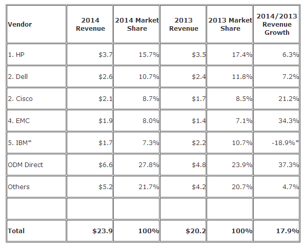 2014年全球云IT基礎設施廠商收入前五家企業(收入單位:十億美元)