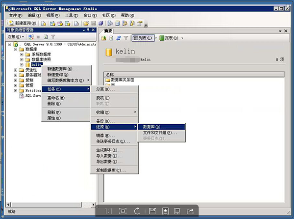 2、右鍵點(diǎn)擊需還原的數(shù)據(jù)庫,選擇”任務(wù)“→”還原“→”數(shù)據(jù)庫“。