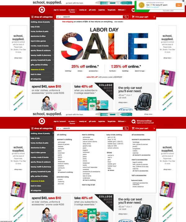 作為大型零售企業的Target ,目前就采用的這樣的設計。這個巨型菜單的完成度極高,兩級式的菜單設計,第一級常駐于頁面,第二級菜單占據的空間是固定的,這樣一來看起來頗為整齊。這樣的設計會讓頁面看起來整齊而干凈。