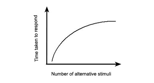 定律內容:一個人面臨的選擇(n)越多,所需要作出決定的時間(T)就越長。用數(shù)學公式表達為反應時間 T=a+b log2(n)。在人機交互中界面中選項越多,意味著用戶做出決定的時間越長。例如比起 2 個菜單,每個菜單有 5 項,用戶會更快得從有 10 項的 1 個菜單中做出選擇。