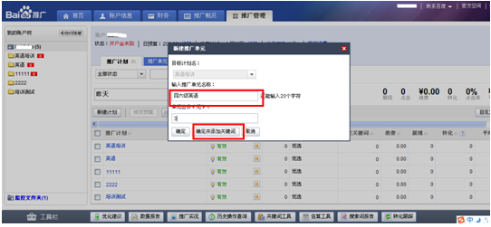新建好計(jì)劃后,輸入推廣單元的名稱,并為剛剛提交的單元設(shè)定一個(gè)出價(jià)。設(shè)置好“單元出價(jià)”后,點(diǎn)擊“確定并添加關(guān)鍵詞”,即可進(jìn)入提交關(guān)鍵詞頁面。(單元的出價(jià)是對(duì)單元中所有關(guān)鍵詞的出價(jià)。例如,您新建了“四六級(jí)英語”單元,為這個(gè)單元設(shè)置的出價(jià)為“3”元,那么“四六級(jí)英語”整個(gè)單元里所有關(guān)鍵詞的出價(jià)都是“3”元。以后如果需要修改出價(jià),可以在推廣單元里修改,也可以直接的關(guān)鍵詞中修改)。