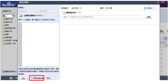您可以自己直接輸入關(guān)鍵詞,也可以采用系統(tǒng)自動(dòng)推薦的優(yōu)質(zhì)關(guān)鍵詞。保存之前,可選擇匹配模式,若勾選“同時(shí)新增創(chuàng)意”,可直接撰寫創(chuàng)意。