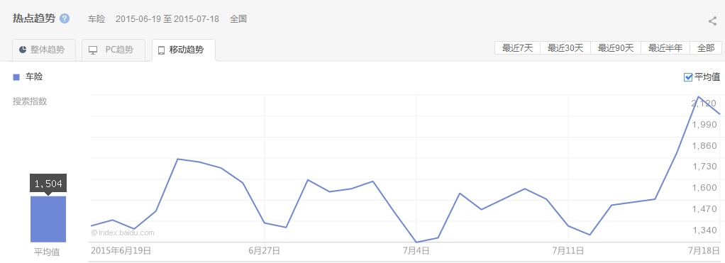 選定關(guān)鍵詞后,我們可以通過(guò)指數(shù)的趨勢(shì)來(lái)查看該關(guān)鍵詞具體的搜索趨勢(shì)以及PC端、WAP端所表現(xiàn)出來(lái)的不同的特點(diǎn),以“車險(xiǎn)”關(guān)鍵詞為例。