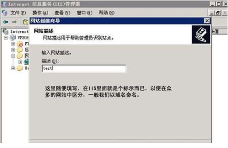 3、輸入網站描述,一般我們寫網站域名,它是網站在IIS里面的標識(名稱)。
