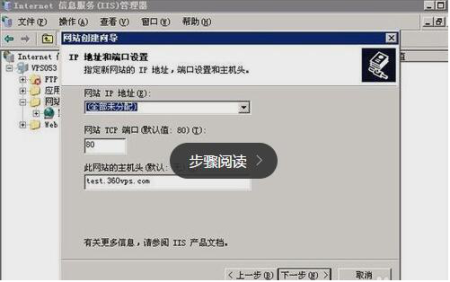 4、這里是比較關鍵的一步,IP地址一般設置“全部未分配”,這樣有個好處:萬一主機變動了IP,你不需要去IIS里面設置,只需要修改下域名解析就可以了。當然,如果你有多個IP,也可以為不同的網站指定不同的IP,端口一般為80,Web服務標準端口。主機頭那里寫你網站的域名,繼續,下一步。