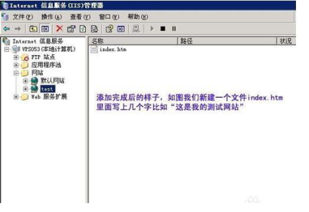 7、添加完成后,我們在d:\wwwroot 創建一個文件index.htm 用記事本打開,寫入測試文字。