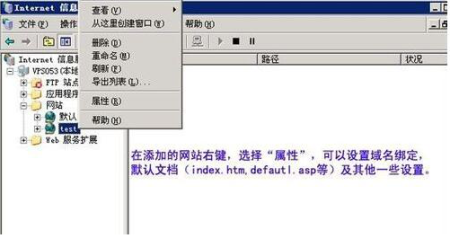 8、添加完成后,可以看到“test” 的網站,如圖:右鍵“屬性”可以綁定域名,設置默認文檔,404錯誤頁,MIME類型等等....