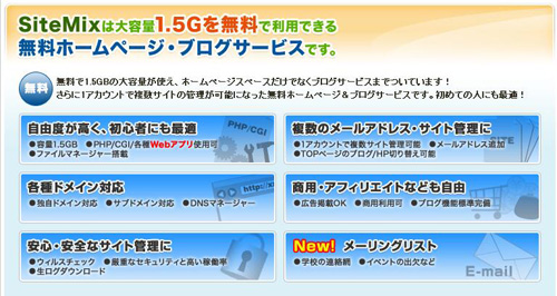SiteMix是一家日本免費(fèi)空間服務(wù)網(wǎng)站,1.5G存儲空間,支持PHP,提供免費(fèi)二級域名1個(gè)或綁定1個(gè)你自己的域名(僅支持頂級域名,二級域名不可以),FTP、Web方式上傳管理文件。