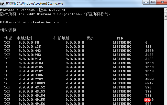 1.開始-》cmd-》輸入命令netstat -ano出現(xiàn)下圖所示(注意下邊顯示有些錯(cuò)位,最后一列是PID):