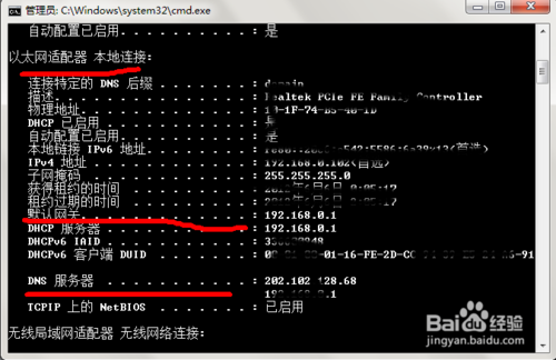 (3)如果(2)沒有問題,那你再輸入ping 你的網(wǎng)關(guān)地址,即你的路由器地址或者交換機(jī)的網(wǎng)關(guān)地址,一般為192.168.0(或者1).1。網(wǎng)關(guān)具體獲取方法是在命令行輸入ipconfig/all,然后找到你當(dāng)前連接網(wǎng)絡(luò)類型對應(yīng)的網(wǎng)關(guān)地址,如圖:圖中第二條紅線