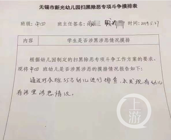 上游新聞?dòng)浾呖吹剑@張《排查表》顯示排查時(shí)間為5月27日,排查對(duì)象是無(wú)錫市新光幼兒園中四班的35名幼兒。《排查表》中對(duì)排查原因描述為:根據(jù)幼兒園制定的掃黑除惡專(zhuān)項(xiàng)斗爭(zhēng)工作方案要求,現(xiàn)將中四班幼兒是否涉黑涉惡的摸排情況報(bào)告如下。回復(fù)是:“通過(guò)對(duì)本班35名幼兒進(jìn)行排查,未發(fā)現(xiàn)有幼兒有涉黑涉惡情況。”表格抬頭,附有兩名班主任老師的簽名。