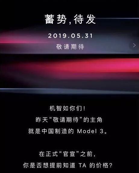 5月28日消息,特斯拉中國今日暗示將于5月31日公布Model 3的消息,消息稱此次公布有可能與國產版Model 3的預訂和價格有關。