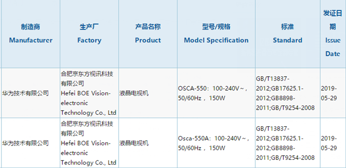 5月30日,中國質量認證中心網站顯示,華為兩款液晶電視機通過3C認證,生產廠商為合肥京東方視訊科技有限公司。