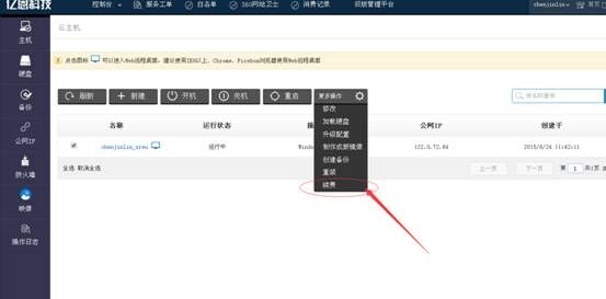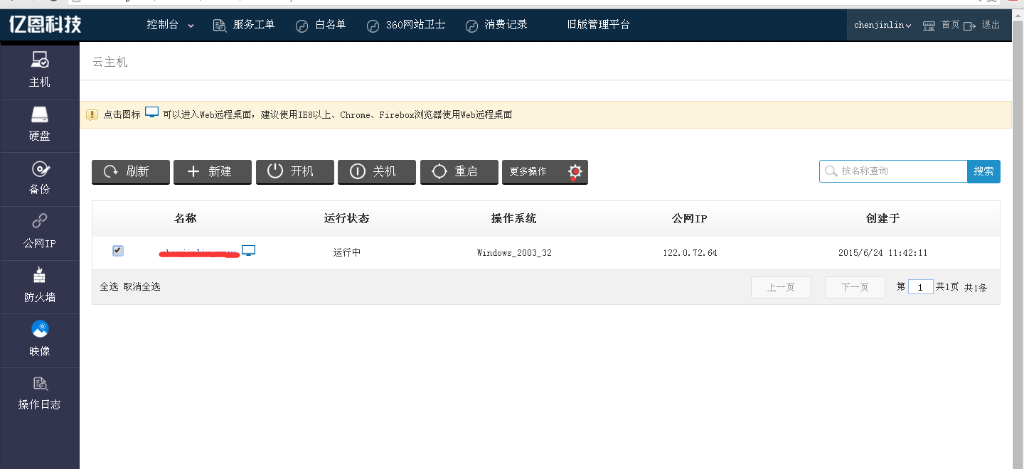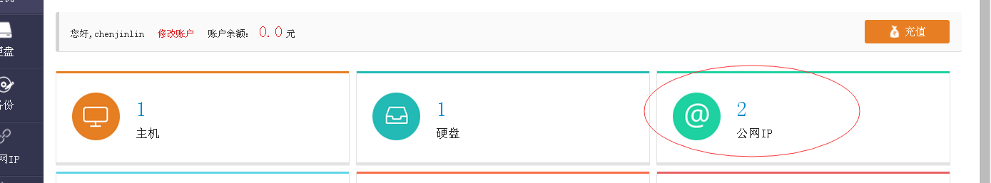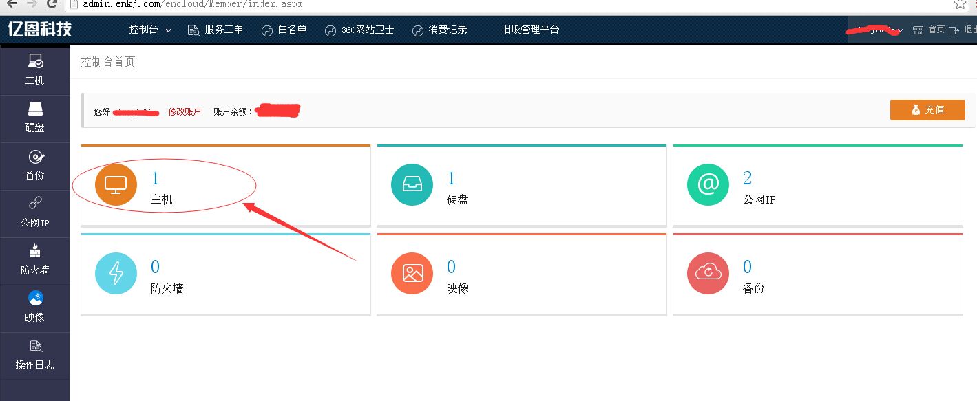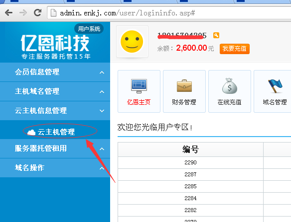 1、首先登陸您會員號,然后找到云主機產品,首先要確定好會員號有續費云主機的費用,如果沒有費用需要先點我要充值,然后在點云主機管理,如圖所示: