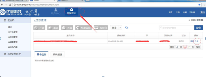 2、在云主機(jī)管理頁面,找到控制中心選項(xiàng)并點(diǎn)擊升級。